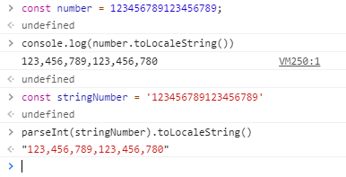 방법은 간단한데 스트링을 parseInt를 사용해 number로 바꾸고, 변환한 것을 toLocaleString을 적용하면 된다.
